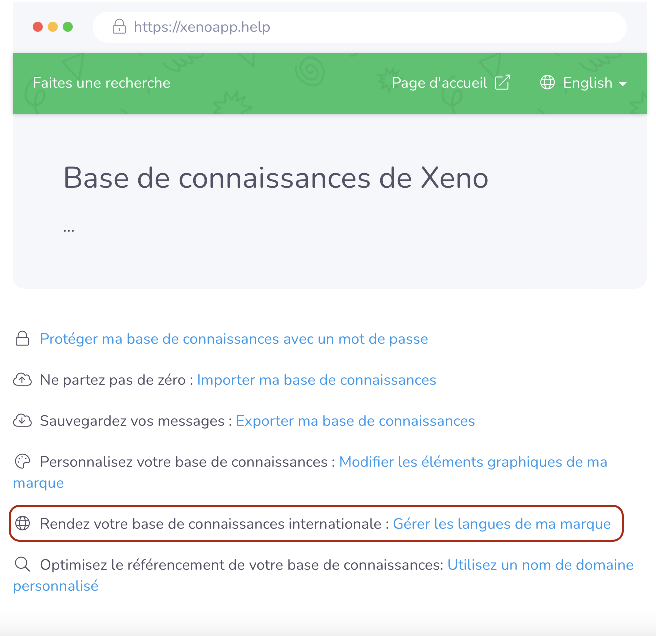 Par exemple, pour activer la traduction en anglais dans la base de connaissances, il vous suffit d'activer l'anglais directement depuis les paramètres de langues.
